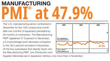 작년 12월 ISM 제조업 PMI는 47.9를 기록하며, 시장 예상치와 전월 수치를 모두 하회했습니다. 특히 10개월 연속으로 경기 확장 기준선인 50을 밑돌며 제조업 위축이 고착화되는 양상입니다.
